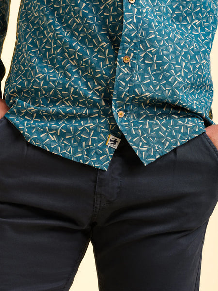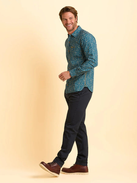 Last minute special occasion? This Benbecula Shirt is the perfect fit. Featuring an abstract all over print, classic collar, contrasting yellow stitch, and a chest pocket. The standout blue hues are the ideal pairing for deep denim and brown boots.